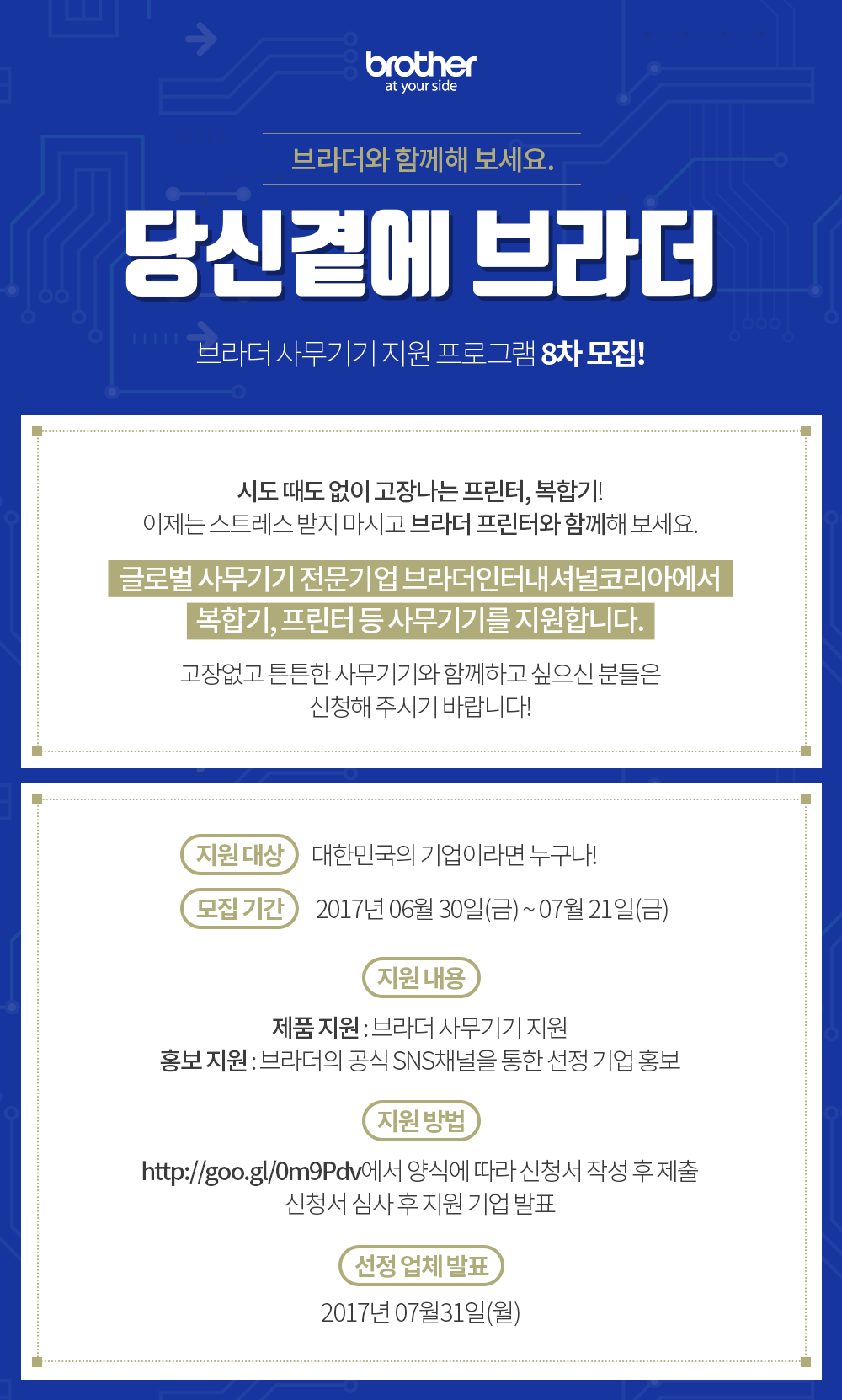 선정 기업은 업무 니즈에 맞는 브라더 제품군을 무상으로 지원받을 수 있으며, 브라더의 공식 블로그와 페이스북을 통한 기업 홍보 기회도 얻게 된다.