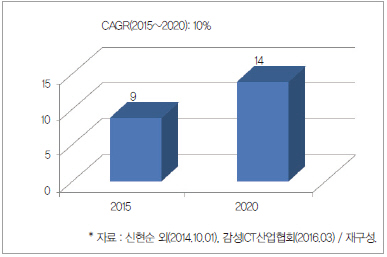 ICT 기술력을 이용한 감성인식 기술개발이 다양한 기술 분야에서 빠르게 확산되고 있다 6). 감성-ICT 융합기술 관련 글로벌 시장규모는 2015년 9,000억 달러에서 연평균 10%의 높은 성장을 지속하여 2020년에는 1조4,000억 달러의 대규모 시장형성을 예상하고 있다. 국내 시장규모는 2015년 24조 원에서 2020년에는 38조 원 규모로 성장할 것으로 예상하고 있다 7),[7][8]. 2015~2020년 사이 감성인식기술의 시장성장 추이를 그림 1-1과 그림 1-2에 나타낸다.