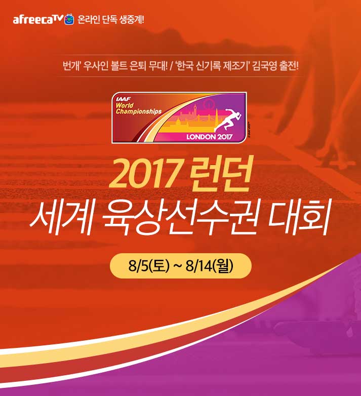 아프리카TV는 5일(이하 한국시간) 영국 런던에서 개막하는 제16회 세계육상선수권대회를 온라인 단독 생중계한다고 밝혔다.