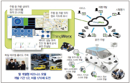 독일의 ThingWorx는 매우 주목받는 사례 중 하나인데, IoT 장치들을 전기자동차 생산품에 탑재했다. 이 자동차는 한 시간만 달려도 엄청난 데이터가 쌓인다. 빅데이터에 대한 초기 데이터 정의를 하고 여기서 쌓인 데이터로 서비스를 개선하며 제품개발에 활용하고 시험 평가를 한다. 결국, 배터리 성능도 개선하고 개발 기간도 단축하고 비용 또한 10분의 1로 줄일 수 있다고 한다.