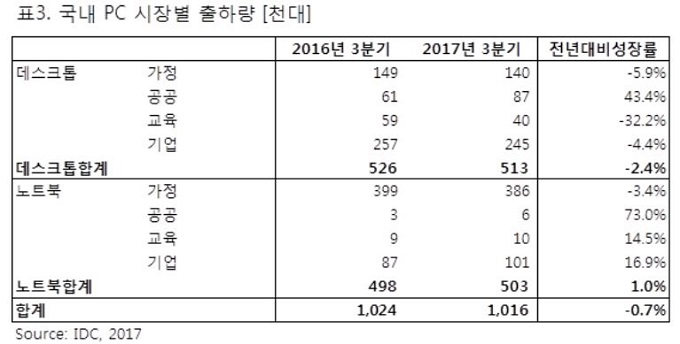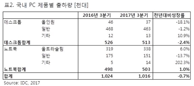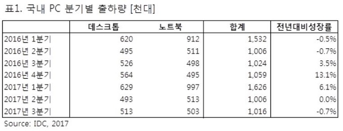 IT 시장 분석 및 컨설팅 기관인 한국IDC의 최근 국내 PC 시장 연구 분석에 따르면, 2017년 3분기 국내 PC 출하량은 데스크톱 51만대, 노트북 50만대, 전체 101만대로 전년 대비 0.7% 하락했다.