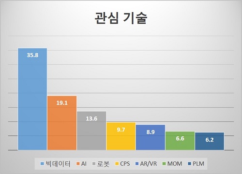 조사 결과에 따르면 스마트 공장 관련 기술 중 가장 필요하다고 생각되는 분야를 묻는 질문에서 35.8%가 빅데이터와 클라우드라고 답했다. 이어서 인공지능이 19.1%를 차지했다.