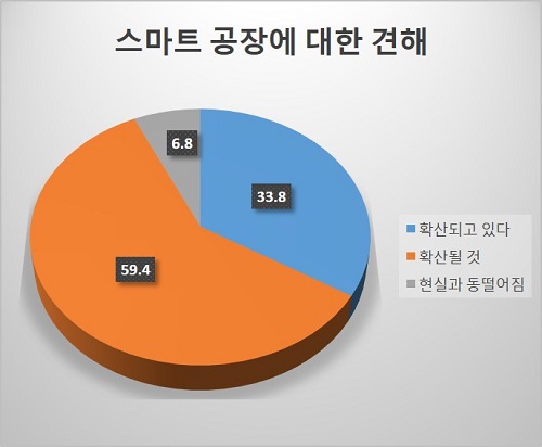 스마트공장에 대한 견해를 묻는 질문에서는 ‘아직은 아니지만 빠른 시일 내에 확산 될 것’이라고 응답한 조사 대상자들은 59.4%로 나타났으며, ‘실제 적용하고 있으며, 확산되고 있다’는 응답자는 33.8%로 조사됐다. 이는 93%가 넘는 응답자들이 스마트 공장을 4차 산업혁명을 실현하는 핵심 요소로 중요하게 생각하고 있는 것으로 풀이된다.