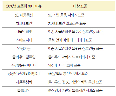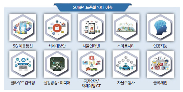 이번에 선정된 이슈를 보면, 4차 산업혁명의 기반이 되는 AI(인공지능)와 ICBM (사물인터넷(IoT), 클라우드 컴퓨팅(Cloud Computing), 빅데이터(Big Data), 모바일(Mobile)) 뿐만 아니라 차세대보안, 블록체인이 포함되어 2018년에는 기반 기술 표준화에 대한 중요성이 더욱 강조될 전망이다. 또한, 스마트시티, 자율주행차, 실감방송·미디어, 공공안전/재해예방ICT와 같은 지능형 융합서비스 실현에 표준화의 진행이 더욱 활발해질 것으로 기대된다.