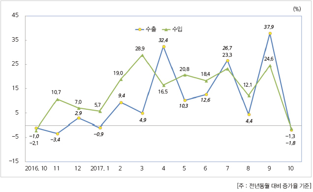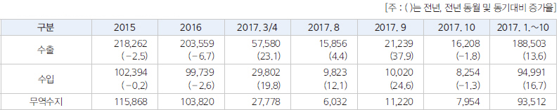 기계산업 수출은 전년동월 대비 1.8% 감소한 162.1억 달러를, 수입은 전년동월 대비 1.3% 감소한 82.5억 달러를 기록해 79.5억 달러의 무역수지 흑자를 냈다. 이와 관련, 본지에서는 한국기계산업진흥회 자본재공제조합의 ‘2017년 10월 기계산업 통계월보’를 바탕으로 기계산업 생산, 출하, 재고 동향 등을 정리했다.