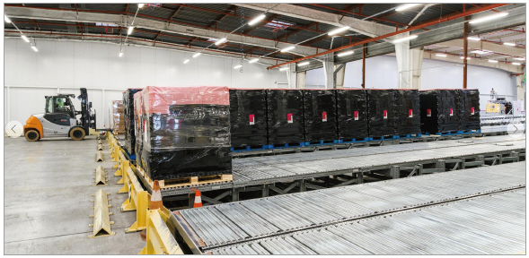 ▲ AGV는 인터롤의 헤비-듀티 그래비(경사) 컨베이어에 팔레트를 두 개씩 배치한다.