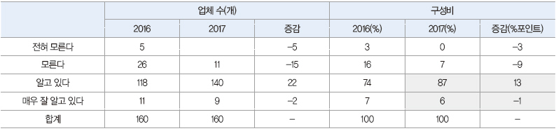 인지도는 표1에서 보듯이 4항목으로 구분했다. 2016년에는 ‘전혀 모른다’와 ‘모른다’의 비율이 각각 3%, 16%를 차지했으나, 2017년에는 ‘전혀 모른다’는 기업들은 더 이상 없으며 ‘모른다’는 기업은 7%로 감소했다. 1년 동안에 4차 산업혁명에 대한 인지도가 12%포인트 이상 상승한 것이다. 그에 따라 2017년의 인지도는 95%로 상승했다. ‘모른다’고 하는 것이 이상하기는 하지만, 여하튼 거의 모든 기업이 4차 산업혁명을 인지하고 있다고 볼 수 있다. 이러한 변화는 고무적인 현상이 아닐 수 없다. 그동안 언론과 각종 세미나 등을 통하여 사회 전체적으로 큰 영향을 미쳤을 것으로 생각된다.