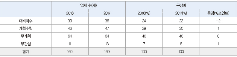 구체적으로 4차 산업혁명을 맞아 투자를 확대하거나 기술개발을 강화해야 할 중견 제조업체들이 역주행을 하고 있는 것이다. 대비착수에 계획수립을 포함하더라도 1%포인트 감소한 것으로 나타난다. 반면 무관심이 1%포인트 증가했고 무계획의 비중은 40%로 변동이 없는 상태이다. 이러한 변화는 앞에서 살펴본 인지도의 변화와 현저하게 다른 양상이다.