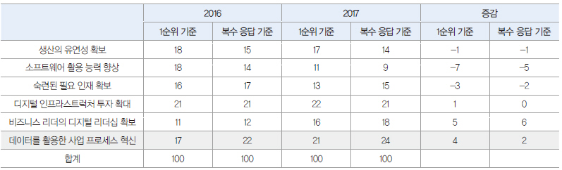 표3에서 보듯이 4차 산업혁명에 대처하기 위한 중점 추진 과제에 대한 질문에서 기업들은 다양한 답을 제시하고 있다. 생산의 유연성 확보를 비롯해서 모든 과제가 4차 산업혁명 추진에 필요한 과제이지만, 가장 핵심적인 과제는 ‘데이터를 활용한 사업 프로세스 혁신’이다. 이에 대한 응답은 1순위 기존으로 2016년 17%에서 2017년 21%로 4%포인트 증가했다. 2순위 응답까지 포함한 복수응답 기준으로는 22%에서 24%로 2%포인트 증가했다. 이러한 변화는 최근 1년간 기업들의 4차 산업혁명에 대한 이해력이 상당히 개선되었음을 의미하는 것으로, 현재 중견제조업체의 5분의 1 또는 4분의 1이 4차 산업혁명의 본질에 근접해가고 있음을 시사한다. 상당히 고무적인 현상이 아닐 수 없다.