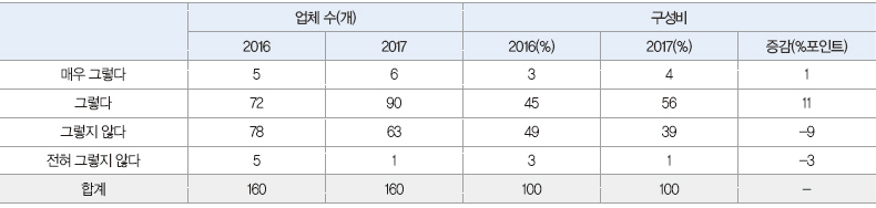 2017년에 위기의식을 매우 심각하게 체감하는 기업은 4%, 보통 체감하는 기업은 56%로 합계 60%의 기업이 위기를 체감하는 것으로 나타난다. 이것은 4차 산업혁명에 대한 인지도와 이해력이 증가하면서 현상유지만으로는 4차 산업혁명에 대처하기 곤란하다고 기업들이 판단할 결과인 것으로 이해할 수 있다.
