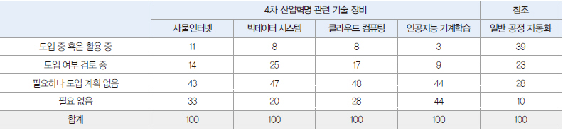 표2에서 살펴본 대응준비와 같은 맥락에서 4차 산업혁명의 대표적인 신기술인 사물인터넷, 빅데이터, 기계학습, 클라우드 컴퓨팅 등의 도입 및 활용 실태를 설문했다. 표 5에서 보듯이 중견 제조업체들이 현재 활용 중이거나 도입 중인 신기술은 사물인터넷 11%, 빅데이터 8%, 클라우드 8%, 인공지능 기계학습 3%로 나타난다. 사물인터넷의 보급·활용률이 가장 높고 인공지능은 가장 낮은 것으로 나타난다.