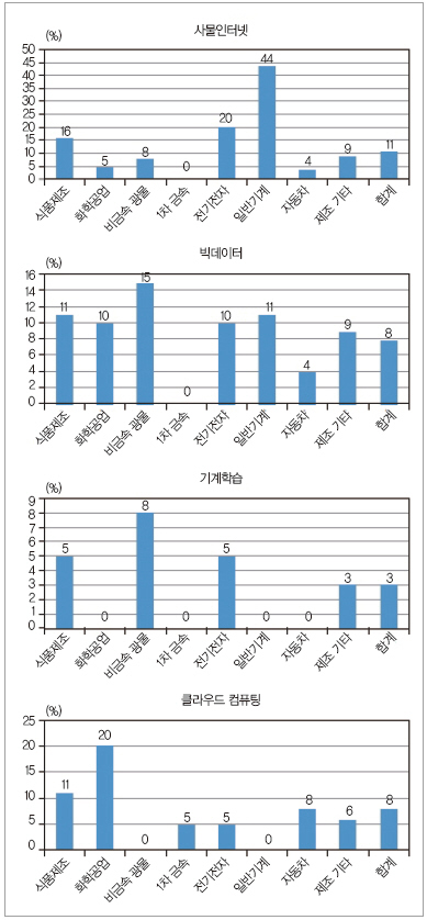신기술의 활용현황을 업종별로 살펴보면 업종 간의 편차가 큰 것으로 나타난다. 사물인터넷의 경우 일반기계산업이 44%의 도입·활용 수준을 나타내고 있으며, 전기전자(20%), 식품제조(16%)가 그 뒤를 잇고 있다. 빅데이터는 비금속광물, 일반기계, 식품제조, 전기전자, 화학공업 등에서 10% 초반의 도입·활용 수준을 나타내고 있다.