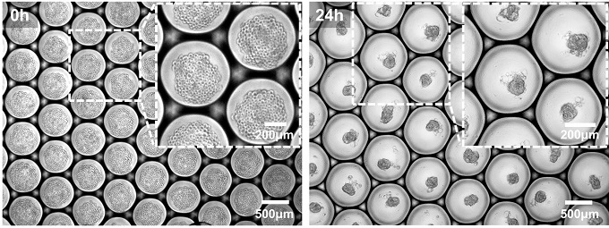 ▲초기 생산한 유방암세포를 포함한 물방울의 사진(왼쪽), 24시간 경과 후 물방울 내 형성된 3차원 종양(오른쪽)