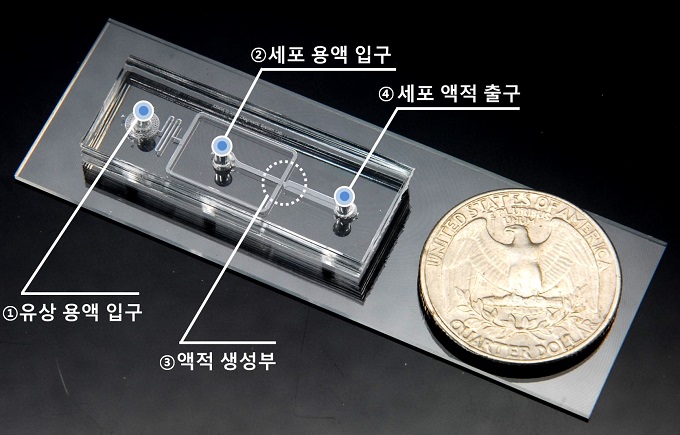 연구팀은 3차원 종양의 대량생산을 위해 물과 기름이 서로 섞이지 않는 특성을 이용했다. 종양 세포가 들어있는 물방울을 ①유상 용액 입구로 주입하고 ②세포 용액 입구로 세포가 포함된 배양액을 주입하면 물과 유상 용액이 섞이지 않는 소수성 원리에 의해 ③액적 생성부에서 암세포를 포함한 물방울이 생산된다. 이를 ④세포 액적 출구를 통해 모아 세포 배양기에서 배양하면 3차원 종양이 형성된다. 동전은 크기 비교를 위한 것으로 100원 짜리 동전과 크기가 동일하다.