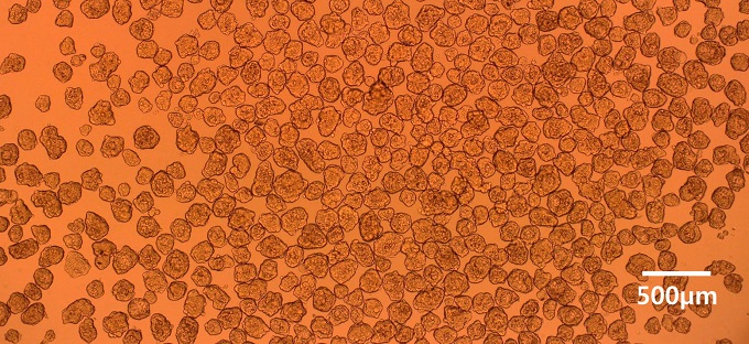 ▲ 미세유체 기반 바이오칩을 이용하여 대량 생산된 유방암 종양의 현미경 사진.