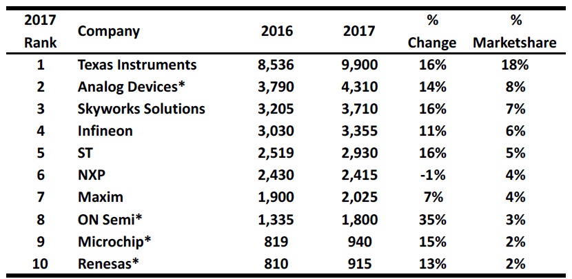 시장 조사기관 IC 인사이츠의 최근 보고서에 따르면 2017년 전세계 아날로그 반도체 매출은 545억 달러를 기록했고, 그 중 상위 10대 IC 공급 업체가 전세계 매출의 59%를 차지했다. 총 10 개 업체의 아날로그 IC 매출은 326억 달러로 2016년 284억 달러와 비교해 14% 증가했고, 시장 점유율은 2% 상승했다. 특히 상위 10개 업체 중에서 8개 업체가 전년 대비 매출 증가율이 두 자릿수 이상을 기록했다.