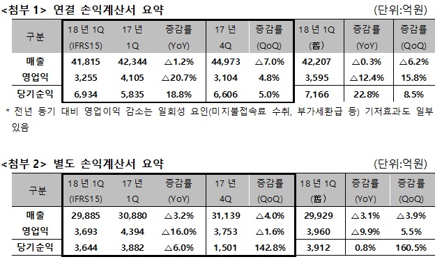 SK텔레콤은 연결 재무제표 기준으로 2018년 1분기 매출 4조 1815억, 영업이익 3255억, 순이익 6934억의 실적을 기록 했다고 4일 밝혔다.