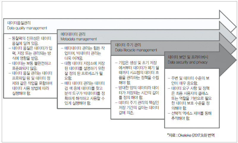 데이터 거버넌스의 주요 기능은 그림 1과 같이, 크게 데이터품질 관리, 메타데이터 관리, 데이터 주기 관리, 그리고 데이터 보안 및 프라이버시 등 네 가지로 구분된다. 데이터 거버넌스 기능에서 가장 중요한 것은 보다 광범위하게 사용하기 위해 우선시 할 필요가 있는 데이터의 유형을 보는 것과 프라이버시와 투명성을 확보하는 방법, 그리고 각 비즈니스 니즈에 맞춰 이에 대한 책임을 수행하는 사람들이 참여하여 전사적인 전략을 수립하고 실천에 옮기는 것이다. 데이터 거버넌스 프레임워크 하에 전략을 제대로 수립하면, 사용자들은 데이터를 더 신뢰하게 되고, 기업 내에서의 비즈니스 인사이트, 경영 의사결정, 경쟁력 제고 등에 활용할 수 있을 것이다.