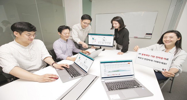 ▲KT 직원들이 블록체인과 인공지능 기술을 결집한 '전력중개사업 시스템'을 시연해 보이고 있다.