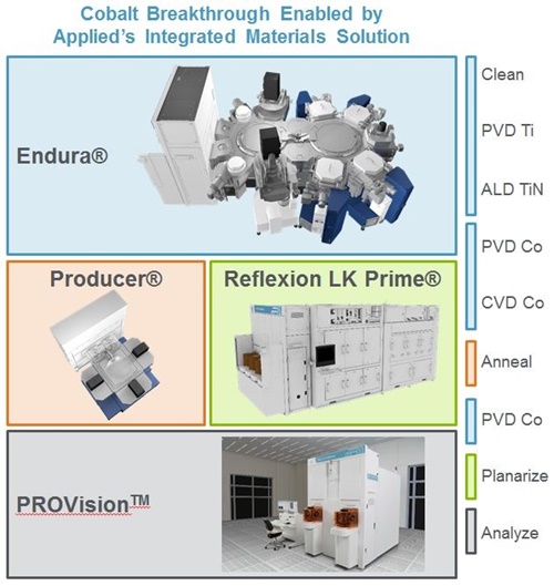 어플라이드머티어리얼즈는 코발트를 트랜지스터 콘택트와 인터커넥트의 새로운 전도 재료로 활용하기 위해 엔듀라 (Endura) 플랫폼에 프리클린(Pre-clean), 물리기상증착(PVD), 단원자층 증착기술(ALD), 화학증기증착(CVD) 시스템 등 여러 재료공학 단계를 결합했다. 또한, 프로듀서(Producer) 플랫폼에 열처리 시스템, 리플렉션(Reflexion) LK Prime CMP 플랫폼에 평탄화 시스템, 프로비전(PROVision) 장비에 전자빔(e-beam) 검사 시스템을 각각 추가해 코발트를 활용하는 통합 제품군을 제공한다. 고객사는 어플라이드머티어리얼즈의 새로운 통합 재료 솔루션으로 제품 출시 기간을 단축하고 7나노 파운드리 노드와 그 이상에서 칩 성능을 개선할 수 있다.