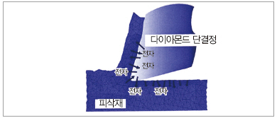 또한 다이아몬드 단결정 공구는 날끝 라운드를 작게 할 수 있는데, 마이너스성 전자 친화력이 원인으로 절삭날이 극단적으로 마모된다(그림 2).