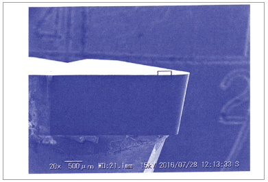 CMP(Chemical Mechanical Polishing) 공정은 콜로이달 실리카를 주체로 한 연마 공정으로, Si 및 C 원자의 산화에 의해 Si-C 결합의 백 본드로부터 전자의 이동이 생긴 결과, 백 본드의 결합력이 약해짐에 따라 생긴다고 생각된다. 다음 그림에 SiC 단결정 공구의 SEM 화상을 나타냈다. SiC 단결정 팁을 그림 5와 같이 설치해 촬영했다.