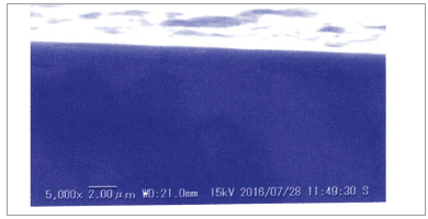 그림 6은 20배로 한 SiC 단결정 절삭날 전체의 영상이다. 그림 6의 네모 모양으로 둘러싼 부분을 5,000배로 확대한 영상을 그림 7에 나타냈다. 능선의 치핑은 제거되어 있는 것을 알 수 있다. SiC 단결정의 가공 왜곡층은 원자적 결합이 잘라져 있으며, 그 부분은 비교적 고속으로 제거할 수 있다. 한편, 단결정부는 CMP 속도가 느리기 때문에 자기조직화적으로 CMP 가공에 의해 전가공을 하여 왜곡층이 없는 날부를 얻을 수 있다.
