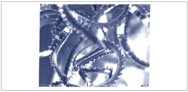 앞에서 말한 제조법으로 제작한 SiC 단결정 팁을 사용한 항공기 부품 재료의 β 티탄을 선삭가공 중인 사진(그림 12)과 가공 후의 절삭면 확대 사진(그림 13)을 나타냈다. 절입량은 0.01mm, 절삭칩은 실 모양으로 이어져 있는 모습을 확인할 수 있었다.