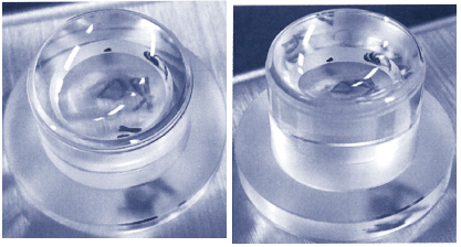 콘택트렌즈 재료를 직경 14mm, 높이 8mm의 원주 형상을, 직경 12.7mm, 높이 7mm로 가공했다. 절삭 개시 직후부터 단결정 바이트와 동등한 절삭면이 되어 있으며, 절삭 속도를 올린 결과 단결정 바이트와 동일한 속도로 절삭할 수 있었다. 그림 16에 렌즈 재료의 절삭 조건과 동일한 조건으로 절삭한 아크릴 수지를 나타냈다.