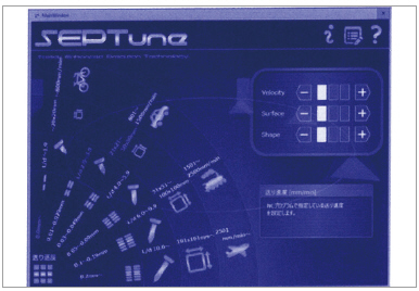주로 미세 고속 절삭가공 분야에서 CNC 장치의 고속 고정도 윤곽제어는 필수의 기능이다. 이 기능을 사용하는 경우, 베스트 절삭 동작 조건 파라미터는 시험가공을 하여 결정하는 경우가 많아 낭비되는 시간으로 되어 있다. 이에 유저가 요구하는 가공 결과로 하기 위한 최적 절삭 동작 조건 파라미터를 용이하게 선출하는 것을 목적으로 한 지원 시스템 ‘SEPTune(셉튠)’을 개발했다.