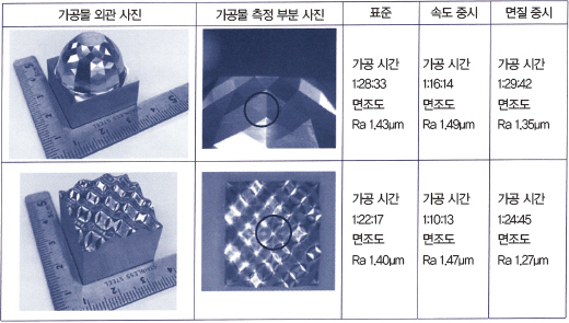 SEPTune으로 선출된 표준 조건 [‘잔삭값’, ‘손잡이길이(L/D)’, ‘가공 범위’, ‘절삭 이송 속도(F값)’을 선택했을 때에 선출되는 조건], 속도를 중시한 미조정 조건, 면질을 중시한 미조정 조건의 각각으로 가공한 2가지 형상의 가공 시간과 면조도를 그림 6에 나타냈다. 면조도는 그림 6의 가공물 측정 부분 사진의 동그라미로 둘러싸인 부분을 레이저 마이크로스코프로 측정했다.