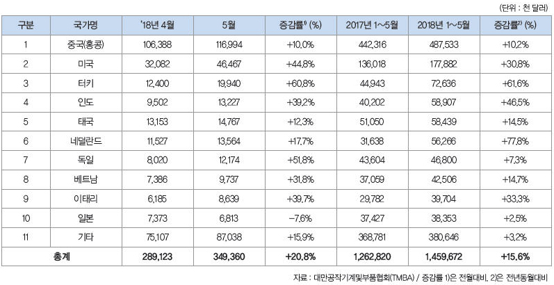 ▲ 2018년 5월 대만의 국가별 공작기계 수출 현황