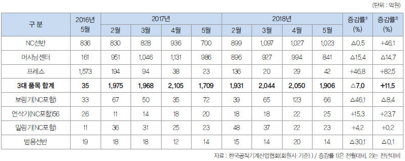 2018년 5월 품목별 수주를 보면, NC절삭기계는 전월대비 4.4% 감소한 2,163억원을 기록했다. 범용절삭기계 또한 전월대비 36.4% 감소한 66억원을 기록했다. 반면 성형기계는 52.9% 증가한 49억원을 기록했다.