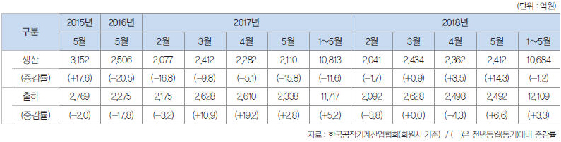 2018년 5월 공작기계 수주는 전월대비 5.0% 감소한 2,278억원을 기록했다. 전년동월대비로도 16.5% 감소한 금액이다. 내수 수주는 957억원으로 전월대비 17.4%, 전년동월대비 42.0% 감소했다. 수출 수주은 1,321억원으로 전월대비 6.6% 증가했다. 전년동월과 대비해서는 22.6% 증가했다.
