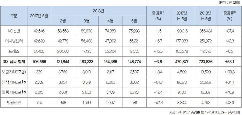 2018년 5월 공작기계 수출은 2억1,000만 달러로 전월대비 3.2% 감소했다. 전년동월과 비교해서는 20.1% 증가했다. 1~5월 수출은 10억1,500만 달러로 전년동기대비 9.6% 증가했다.