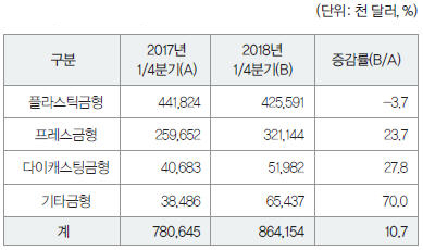 한국금형공업협동조합(이하 조합)이 국제 산업 분류 HSK Code를 기반으로 2018년도 1/4분기 금형 수출입 실적을 분석한 결과 올해 1/4분기 금형 수출 또한 8억 6,415만 달러를 기록하며 지난해 동기 대비 10.7% 상승한 것으로 나타났다. 하지만 이는 수출 호황기를 누리고 있는 타 기계산업 분야에 비해 수출 증가폭은 크지 않은 편이라고 조합측은 분석했다.