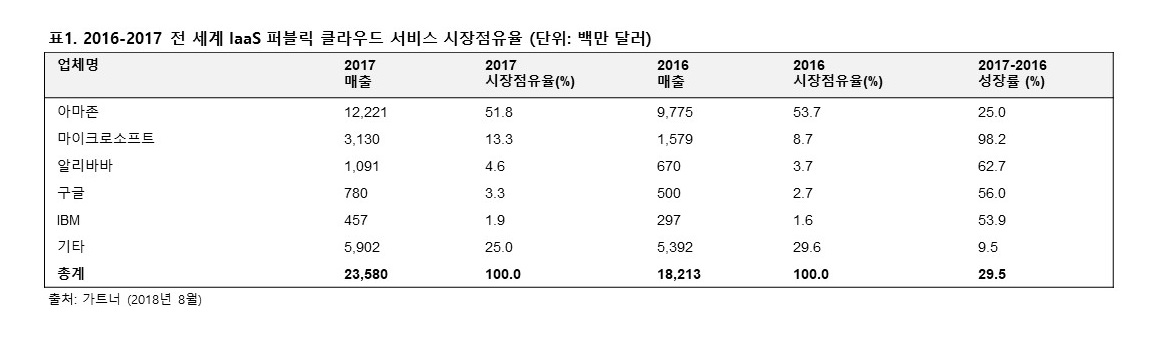 ▲표1. 2016-2017 전 세계 IaaS 퍼블릭 클라우드 서비스 시장점유율 (단위: 백만 달러)