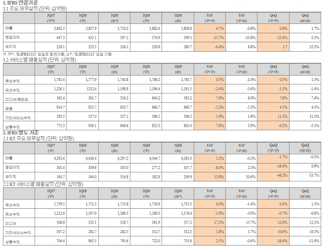 KT는 2018년 2분기 연결기준 매출 5조8069억 원, 영업이익 3991억 원을 기록했다고 3일 밝혔다. 지난해 같은 기간과 비교했을 때 매출은 0.6% 감소, 영업이익은 10.8% 감소했다. 마케팅 비용 증가와 일회성 인건비 요인 등 영업비용 증가가 영업이익 감소에 영향을 미쳤다. 전분기 대비로는 매출, 영업이익, 순이익은 각각 1.7%, 0.5%, 25.2% 증가했다.