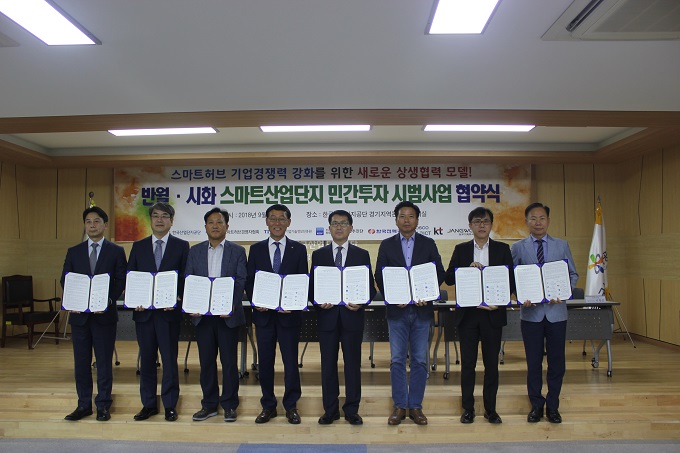 한국산업단지공단(이사장 황규연, 이하 산단공)은 9월 12일(3시) 산단공 경기지역본부 대회의실에서 ‘반월·시화국가산업단지 스마트산업단지 민간투자 시범사업' 업무 협약식을 포스코ICT 컨소시엄(포스코ICT, KT, 한국전력공사, 장우기계, 이하 컨소시엄) 및 스마트허브 경영자협회, 중소기업기술정보진흥원, 민관합동 스마트공장추진단과 함께 체결하였다.