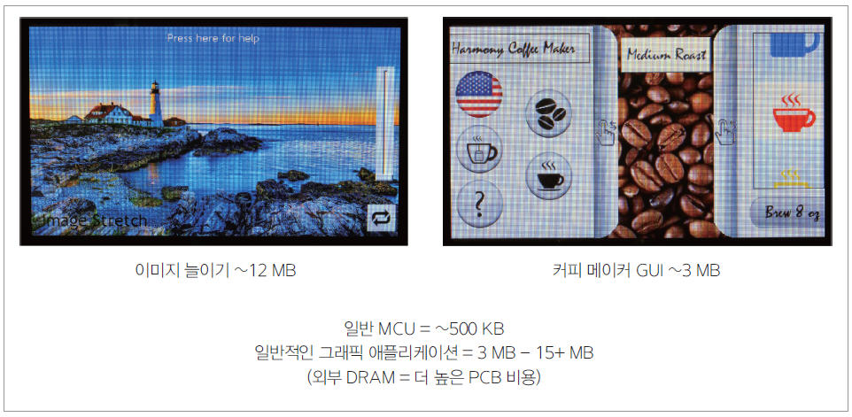 오늘날 대중 시장을 겨냥한 하이엔드 MCU의 통합 SRAM은 최고 수준이 512KB 정도다. 이 용량은 단 한 프레임 버퍼만 필요로 하는 단순한 정적 GUI나, 픽셀당 8비트의 색 선택과 작은 화면만 사용하는 GUI를 구동하는 데 충분하다. 하지만 현재 시장 트렌드에 따르면 최종 사용자들은 임베디드 디바이스 인터페이스에서도 스마트폰에서 사용하는 앱과 유사한 경험을 원한다. 또한 업체들은 모든 GUI가 브랜드 정체성과 충성도를 높일 수 있도록 자사 브랜드를 정확하게 나타내기를 원한다. 매끄럽고 풍부한 그래픽 사용자 인터페이스에는 다중 프레임 버퍼, 다중 레이어 오버레이, 그리고 더 큰 색 심도가 포함돼야 한다. 색 심도의 경우 애플리케이션 그래픽이 사진과 같은 실사를 표현하거나 특정 브랜드 색상과 정확히 일치되어야 할 때 특히 중요하다.