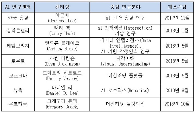지난해 11월 한국 AI 총괄센터를 시작으로 올해 1월 미국 실리콘밸리, 5월 영국 케임브리지, 캐나다 토론토, 러시아 모스크바, 그리고 지난달 개소한 미국 뉴욕 AI 연구센터에 이어 7번째다.