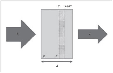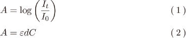 흡수분광법에 의한 농도의 결정은 그림 2에 개요도를 나타냈는데, 입사광 강도 I0과 투과광 강도 It을 계측, 이들의 비율인 흡광도 A가 측정 대상부에 존재하는 가스의 농도 C , 광로 길이 d, 분자 고유 빛의 흡수 단면적 ε(그림 1의 세로축에 해당하는 값)에 비례한다는 램버트비어(Lambert-Beer)의 법칙에 기초해 결정된다.
