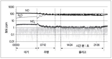 ▲ 그림 4 FTIR를 이용한 굴착기의 배출가스에 포함되는 아산화질소 계측 예