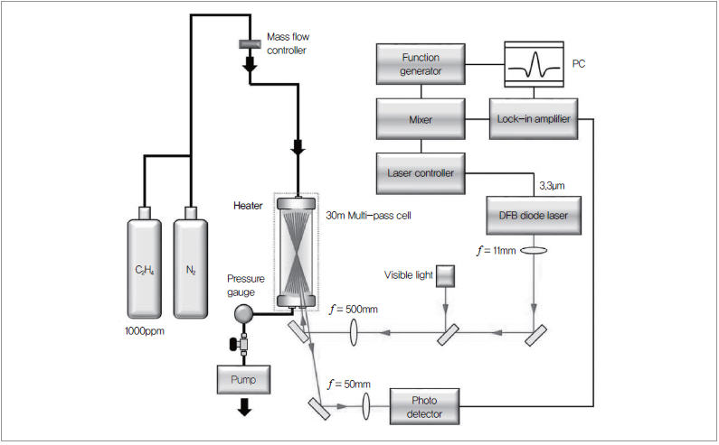 WMS법을 이용한 가스 계측장치의 한 예를 그림 7에 나타냈다. 이것은 엔진 배출가스 중의 에틸렌 계측을 주된 목적으로 구축된 장치로, 광원에는 중적외 영역인 3.3μm의 빛을 발진하는 인터밴드 캐스케이드 레이저를 사용하고 있다. 변조가 걸린 레이저광을 광로 길이 30m의 Herriott형 다중 반사 셀에 도입, 투과 후의 레이저광을 디텍터로 검출하고 있다. 검출한 신호는 로크인 앰프를 이용해 변조 주파수 2배의 주파수로 검파, 흡수신호를 검출하고 있다.