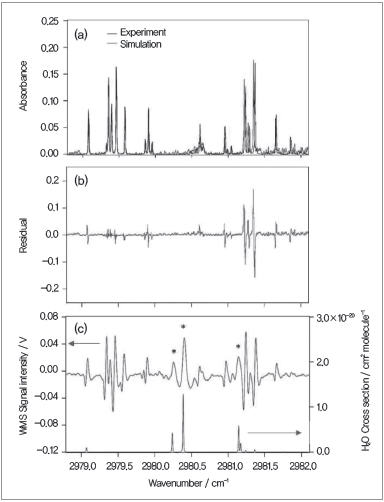 이 장치를 이용해 이미 알고 있는 농도의 에틸렌을 계측한 직접 흡수분광법과 WMS법의 흡수 스펙트럼을 그림 8에 나타냈다. 그래프 (a)는 직접 흡수 스펙트럼으로, HITRAN 데이터베이스에서 계산한 것과 비교하고 있다. (b)는 실험과 계산의 잔차를 나타내고 있는데, 그 값이 작아 실험은 데이터베이스에서 계산한 흡수 스펙트럼과 잘 일치하고 있음을 나타내고 있다. 그래프 (c)는 농도를 그래프 (a)를 취득한 조건에서 1/10로 한 에틸렌 가스의 변조 흡수 스펙트럼인데, 그래프 (a)와 거의 동등한 신호/노이즈 비율로 되어 있으며 감도가 높아지고 있는 것을 나타나고 있다. 또한. 변조 주파수 2배의 성분으로 검파하고 있기 때문에 스펙트럼 형상은 직접 흡수 스펙트럼의 2차 미분을 한 형상으로 되어 있다. 고감도 계측을 할 수 있기 때문에 그래프 (c)에서는 레이저가 셀에 입사하기 전에 대기 중을 투과해 계측된 대기 중의 물 스펙트럼도 나타나고 있다. 이와 같이 WMS법을 이용하면 고감도의 측정이 가능해진다.
