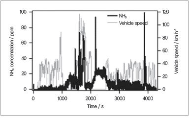 마지막으로 그림 7과 동일한 시스템으로 광원을 1.51μm의 근적외 반도체 레이저로 변경, 가솔린 자동차 배출가스 중의 암모니아를 계측한 결과를 그림 9에 나타냈다. 이것은 장치를 자동차에 탑재, 리얼 월드를 주행 중인 암모니아 농도를 계측한 결과이다. 암모니아가 운전 조건에 따라 변화하고 있는 모습을 알 수 있다. 이와 같이 고감도 분광법에 의해 미량이라도 대기 환경에 영향을 미치는 미규제 가스의 배출 실태 파악도 가능해지고 있다.