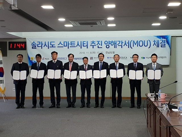 한국전력(대표이사 사장 김종갑)이 11월 8일 전남도청에서 전라남도, 광주과학기술원 등 8개 기관과 함께 ‘솔라시도 스마트시티 추진 양해각서‘를 체결했다고 밝혔다.