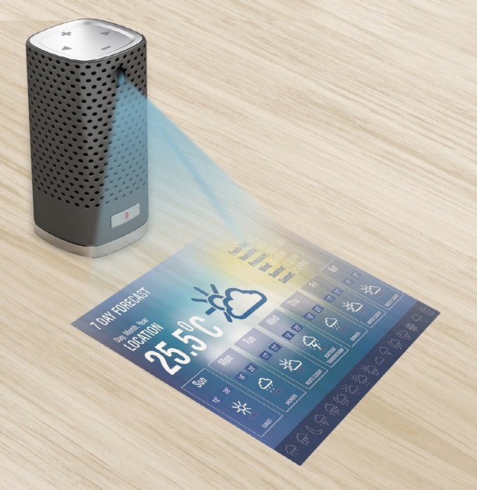 소형 기기라 하더라도 디스플레이의 해상도나 밝기가 떨어지는 것은 원치 않을 것이다. 밝기가 높으면 더 선명한 HD 영상이 가능하고, 프로젝터 화면을 더 크게 할 수 있으며, 주변 빛이 밝은 경우처럼 다양한 조명 상황에서도 더 우수한 가시성을 달성할 수 있다. DLP Pico 0.23인치 제품군에는 현재로서 크기가 가장 작은 HD 디스플레이 칩셋이 포함되어 있으므로, 셔츠 주머니에 들어가는 초저전력 모바일 피코 프로젝터의 설계가 가능하다. 밝기의 효율은 20인치~40인치 디스플레이(최대 200루멘)를 지원하며, 폼팩터는 78mm x 78mm x 15mm(100루멘) 미만이다. 그림 1은 휴대용 스마트 스피커로 표시한 프로젝션 화면이다.