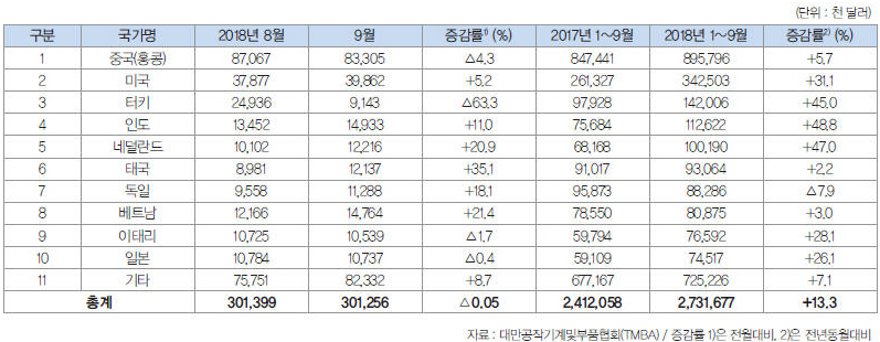 ▲ 2018년 9월 대만의 국가별 공작기계 수출 현황