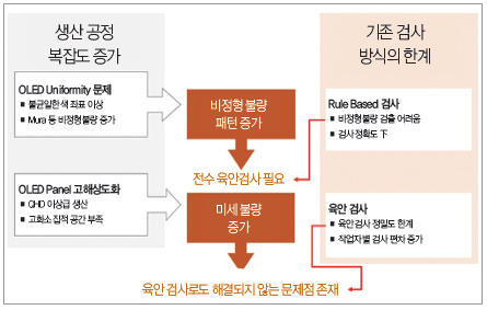 이러한 수요를 충족시킬만한 고품질의 OLED 패널 제조를 위해 가장 중요한 것은 패널에 존재하는 비정형 및 미세 불량까지 잡아내는 높은 검사 정확도다. 그러나, 비정형 불량 및 육안검사가 불가능한 수준의 미세 불량의 경우 기존 방식으로는 검출 불가능하며 이는 곧 패널의 품질 저하로 이어지게 된다.